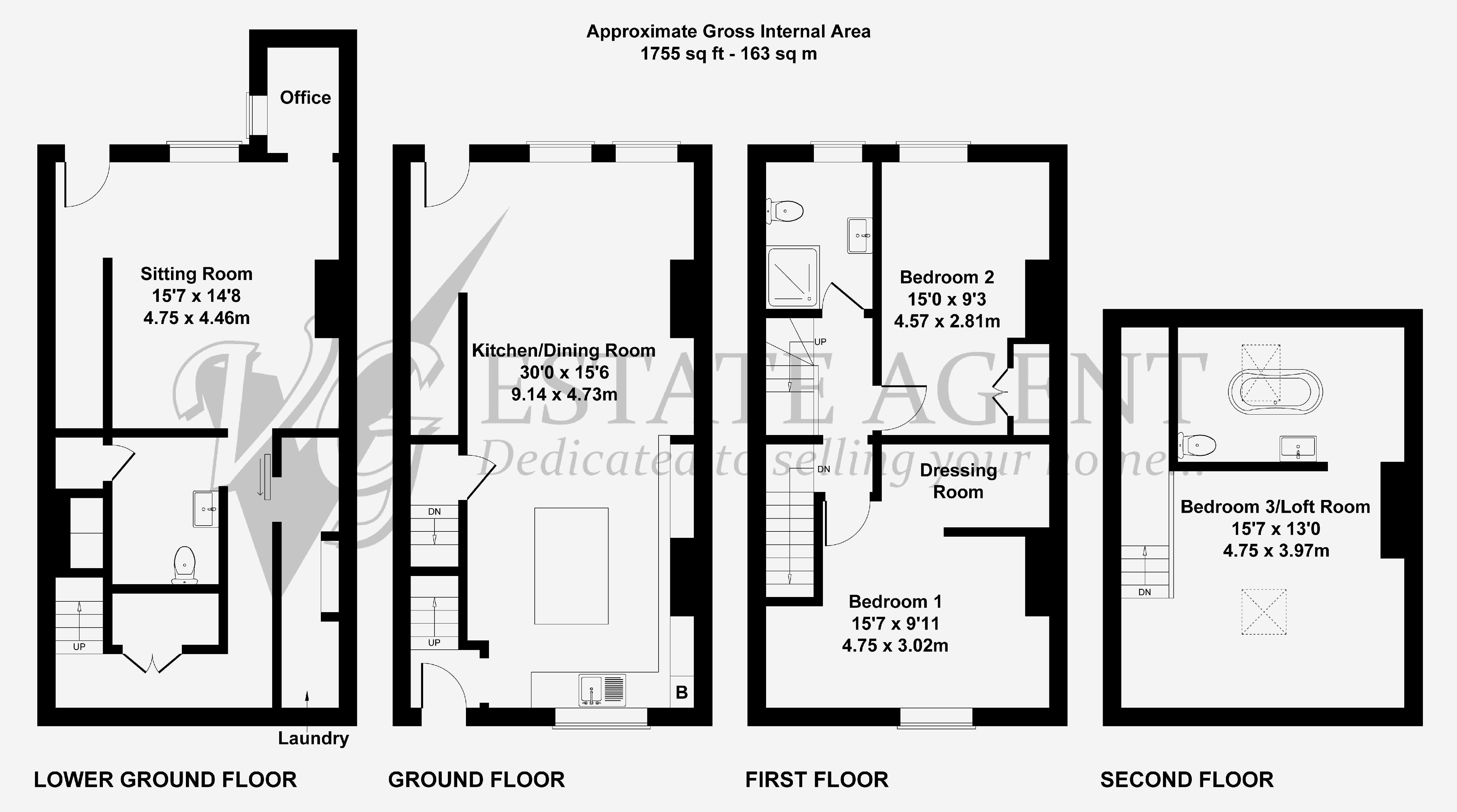 The accommodation is arranged across four floors. The ground floor features a spacious and light-filled open-plan kitchen and dining area, ideal for both everyday living and entertaining. On the lower ground floor, you’ll find a cosy sitting room, a home office, a utility room and a cloakroom.